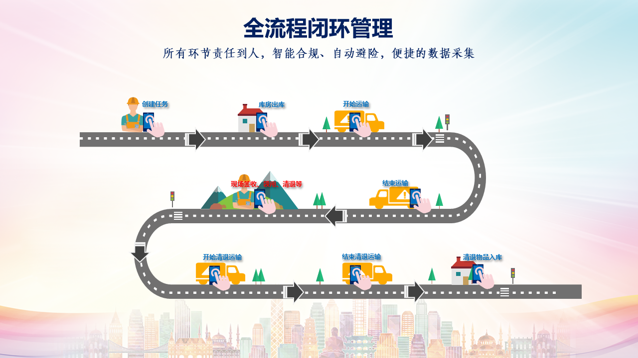 从民爆物品出库、物品运输、现场物品签收、现场作业、现场物品清退、物品清退运输,到物品清退入库,全流程闭环管理,完美记录每一环节,确保所有环节责任到人,通过微信消息,将作业进度即时通知相关人员,将所有项目作业概况定时自动汇报给管理人员。