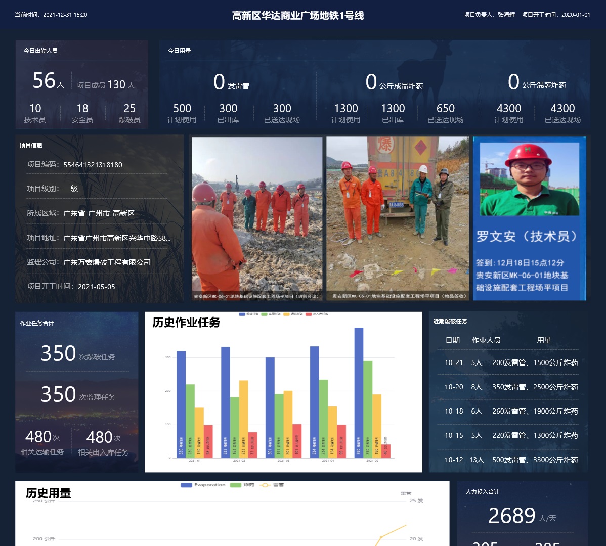 实时显示项目当前的作业情况,今日物品用量,现场人员情况,物品配送情况,现场施工情况,历史作业任务统计、历史用工统计、历史用量统计等。
